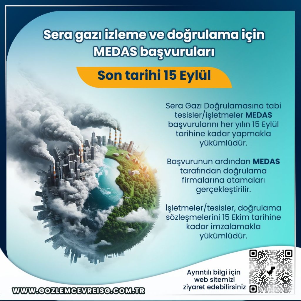 Sera gazı izlemesine tabi tesisler/işletmeler MEDAS başvurularını her yılın 15 Eylül tarihine kadar yapmakla yükümlüdür. Örneğin: 2025 yılınının sera gazı izleme ve doğrulması için 15 Eylül 2025 gününe kadar MEDAS Başvurularının yapılması gereklidir.