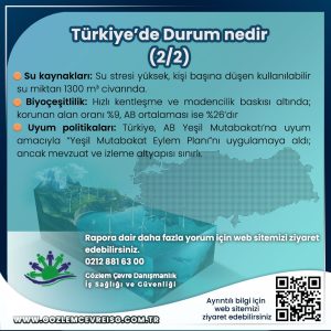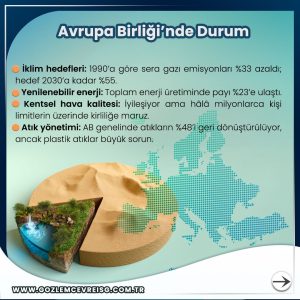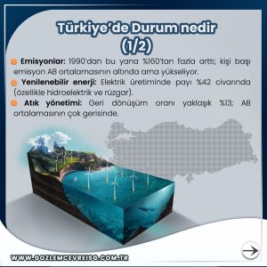 - Uyum politikaları: Türkiye, AB Yeşil Mutabakatı’na uyum amacıyla “Yeşil Mutabakat Eylem Planı”nı uygulamaya aldı; ancak mevzuat ve izleme altyapısı sınırlı.