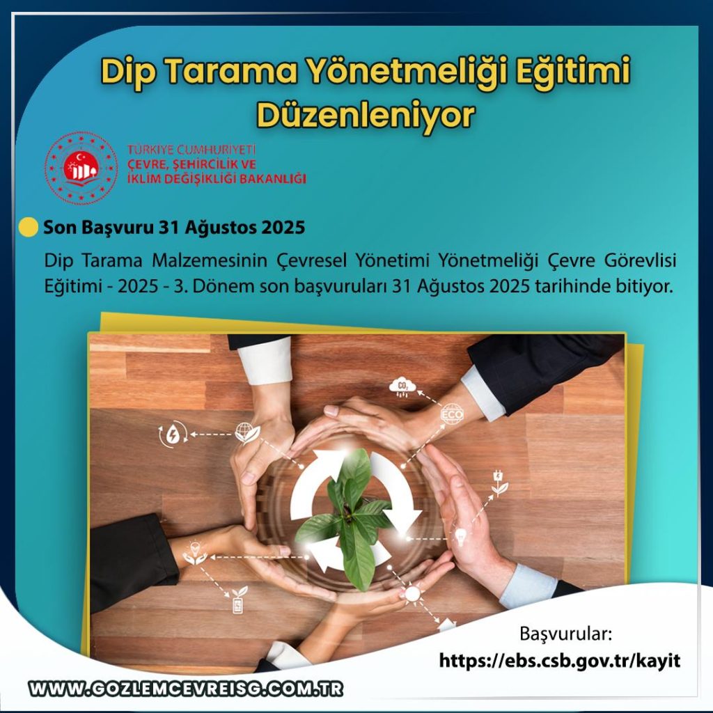 Dip Tarama Malzemesinin Çevresel Yönetimi Yönetmeliği Çevre Görevlisi Eğitimi – 2025 – 3. Dönem son başvuruları 31 Ağustos 2025 tarihinde bitiyor.